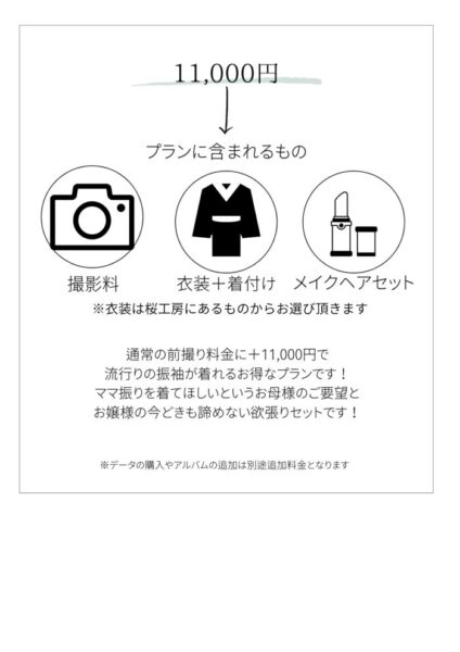 ※衣装は桜工房にあるものからお選び頂きます 2026/2/11 最終更新日時 : 2026/2/11 sakurakoubou_master 桜工房プレミアム 営業時間:10時~18時定休日:毎週火曜日・月末火曜日水曜日TEL:0565-32-7747HP: https://sakurakoubou.com