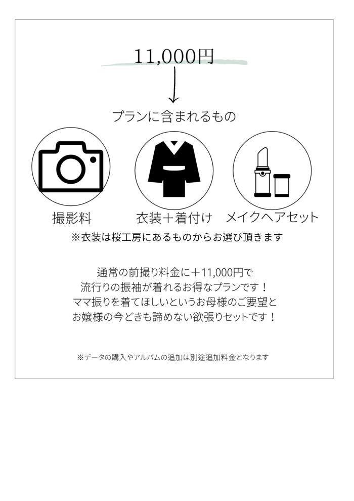 成人式には行かないけど写真だけは撮っておきたい方や、普通の前撮りに+で流行りの着物も記念に写真を残しておきたい方などにおすすめのパックとなっております!後撮りでもOK!