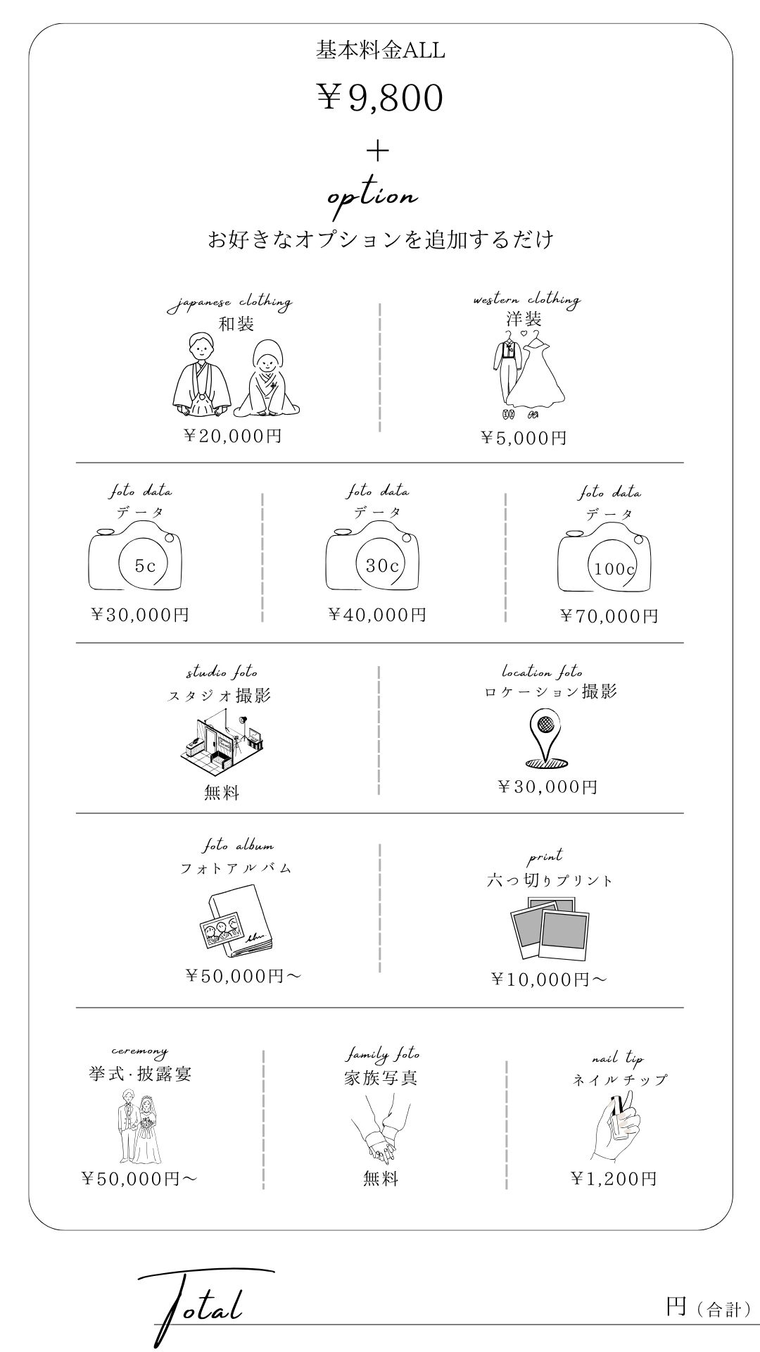 オプション、和装、洋装にはヘア、メイク、着付け、衣装レンタル代が含まれております。